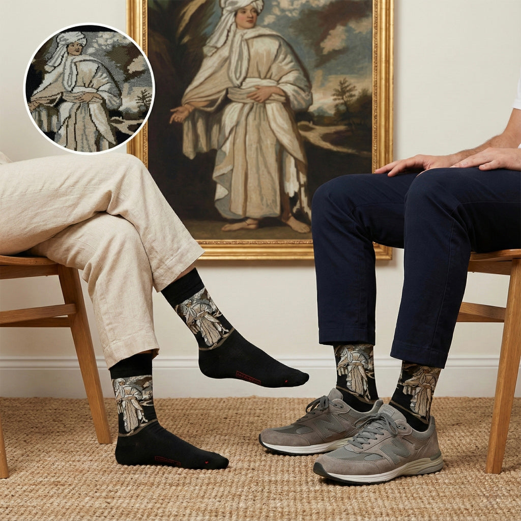 Model uniseks čarapa izrađen je s mislima na svakoga od vas. Bez obzira tko ste ili što vam kažu da ne možete postići (gleda vas direkto kao neko slavljivo djelo Joshue Reynoldsa), ove čarape uvijek govore: "Da, ti možeš." S 80% pamuka, vaše će noge biti obavijene mekoćom kao da su upravo izašle iz Reynoldsovog portreta Omaija. Dodajemo mrvicu poliamida i elastina za onaj savršeni osjećaj elastične podpore - noćna mora za one iritantne rupe i klizanje! Sigurno je reći, ove čarape dolaze iz jedne od najfinijih čarapetvornica u Turskoj - da, VESTIDO nije šala kad govore o kvaliteti. Kako bismo zaštitili ovu umjetnost za noge, bez dozvole ne možete objaviti ni jednu sliku ovih remek-djela. Znači, ostavite čarape na nogama, a kamere izvan dosega. Ali slobodno se osjećajte kao da ste glavni lik portreta svaki put kad ih obučete!