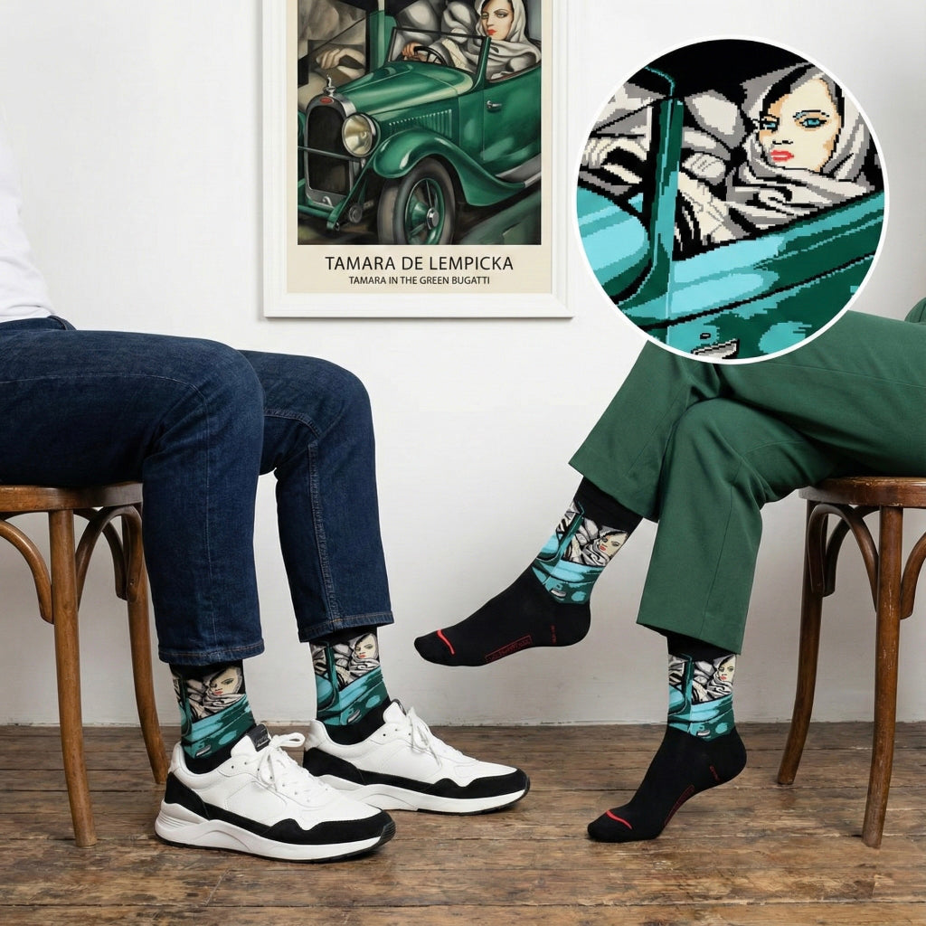 Crne čarape s motivom Tamare de Lempicke u zelenom Bugattiju