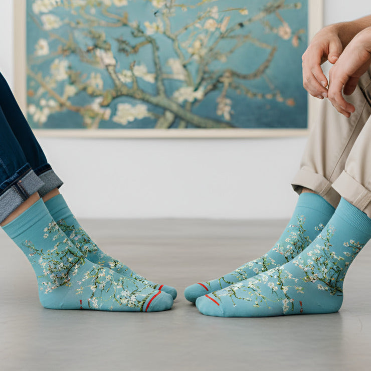 Lagane plave čarape s dizajnom cvijeta badema izrađene od 80% pamuka za iznimnu mekoću. Zahvaljujući poliamidu i elastanu, čarape pružaju izvanrednu udobnost i fleksibilnost, dopuštajući neometano kretanje. Unisex model prikladan je za sve veličine stopala. Izrađene u Turskoj i inspirirane Van Goghovim remek-djelom, savršen su spoj umjetnosti i udobnosti. VestSocks odlikuje se kvalitetom i jedinstvenim vizualima iz kreativne