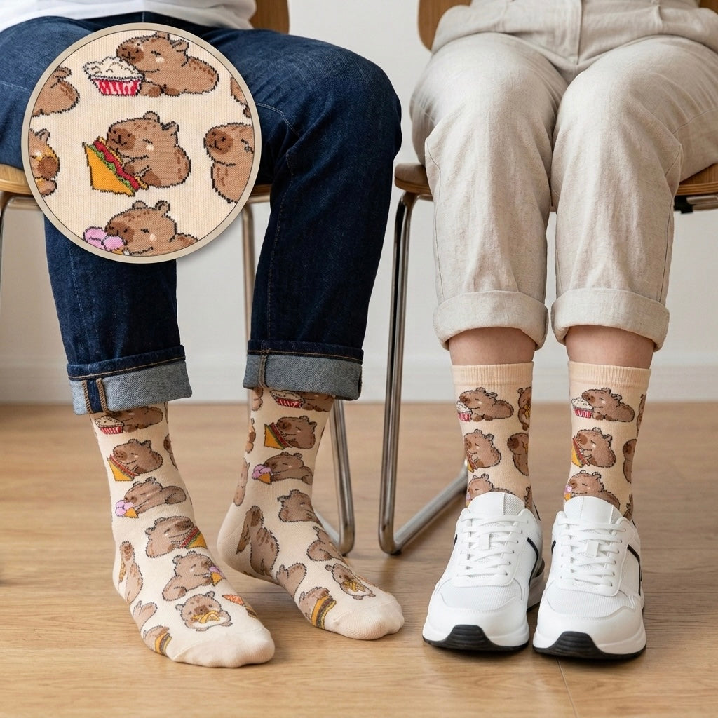 Udobne bež Capybara Čarape s pikseliziranim uzorkom kapibara koje jedu pizzu i sladoled. Kvalitetan materijal i moderan dizajn pružaju maksimalnu udobnost za veličine 36-44.
