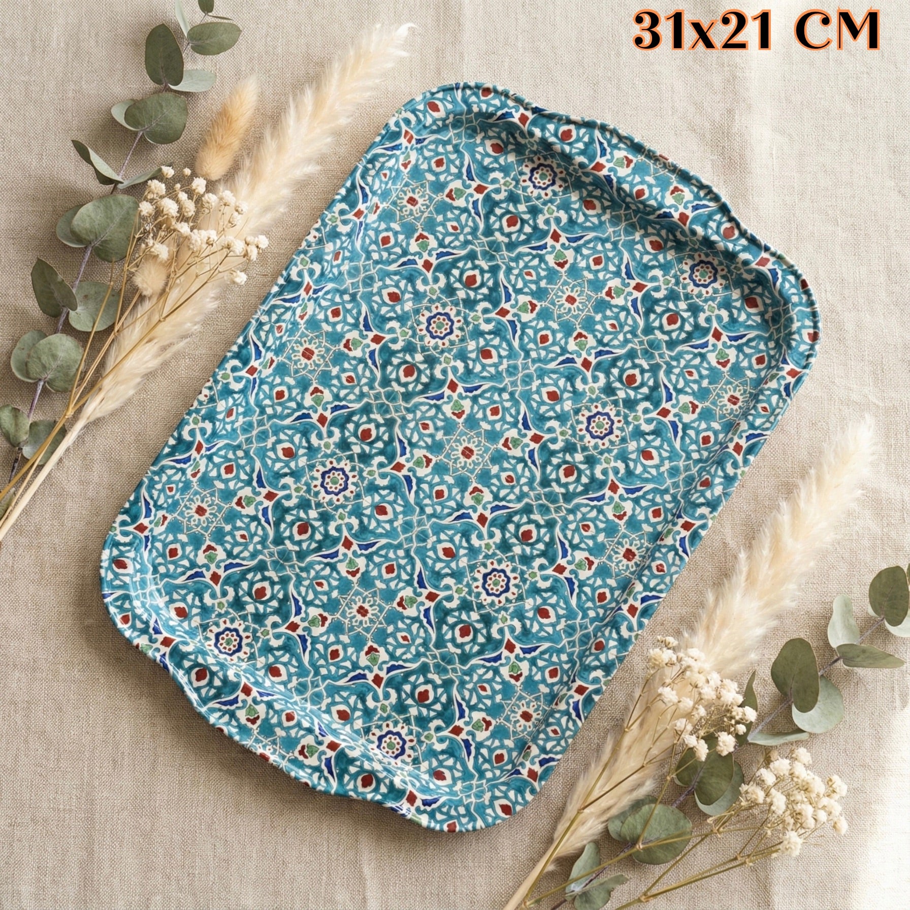 TRADICIONALNA METALNA TACNA: Oživite svaki trenutak posluživanja! Pravokutna posuda s valovitim rubovima i živopisnom tirkiznom podlogom. Složeni cvjetni i geometrijski uzorci u crvenoj, plavoj i bijeloj boji donose dašak tradicije. Savršena za kuhinju i blagovaonicu, ovo serviranje podiže svako stolno posuđe.