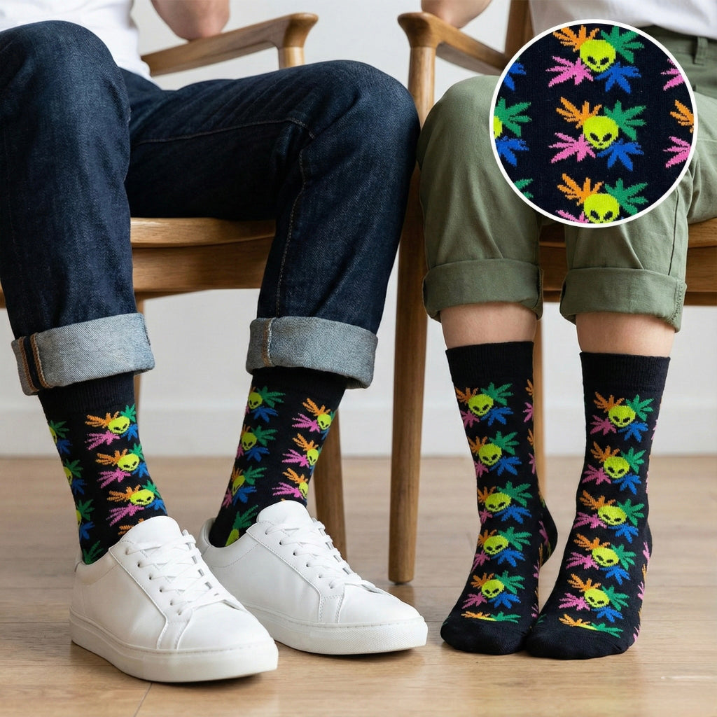 Ali pazite, dragi ljubitelji marihuana vanzemaljac Čarapa, ne zaboravite da su ove zvjezdane čarape kreacija jedinstvene Vestido kompanije. Svaka vizualna reprodukcija bez dozvole mogla bi rezultirati posjetom jednog stvarnog vanzemaljca – i to naravno bez čarapa!