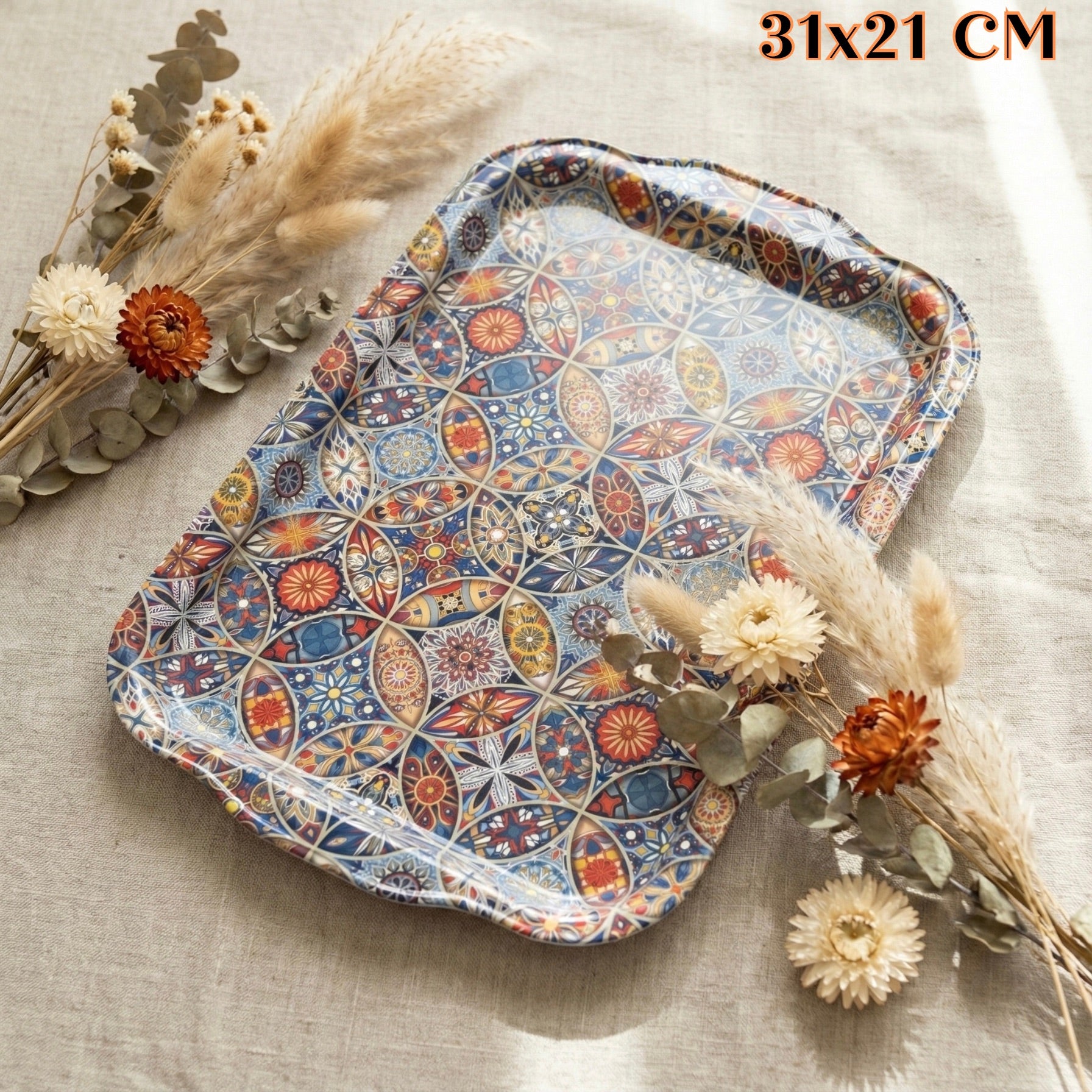 Uzdignite svoje posluživanje! Ova TRADICIONALNA METALNA TACNA blista živopisnim, zamršenim geometrijskim uzorkom u plavim, narančastim i zlatnim tonovima. Savršeno za svaku prigodu!
