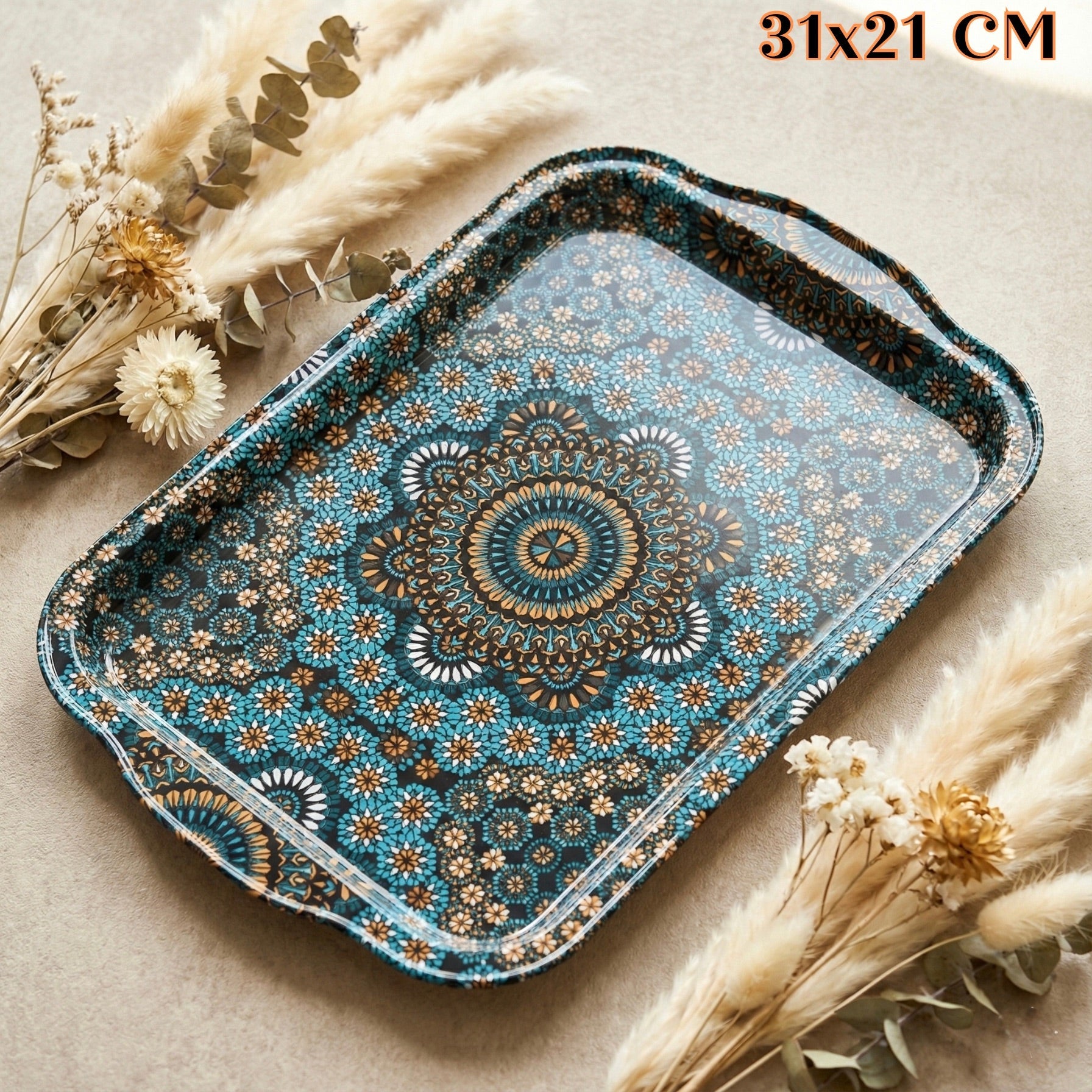 TRADICIONALNA METALNA TACNA: Oživite svoja posluživanja! Pravokutna posuda s plavim i zlatnim mandala uzorkom. Valoviti rubovi dodaju eleganciju svakom stolu. Savršena za kuhinju, blagovaonicu i dom.