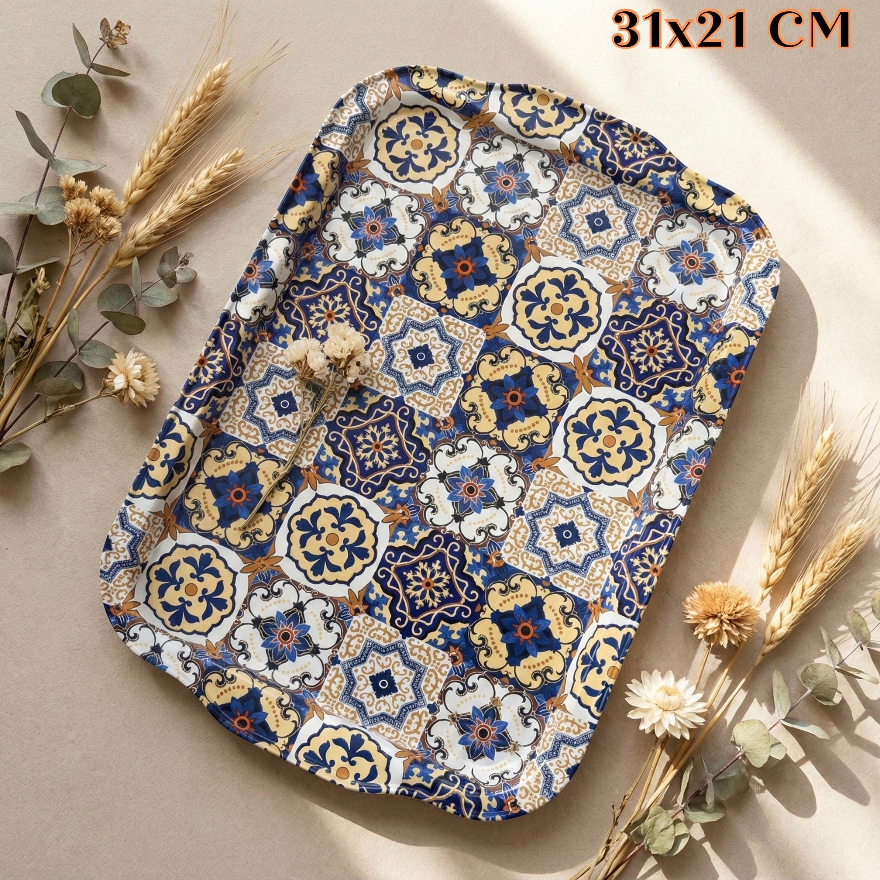 Otkrijte TRADICIONALNA METALNA TACNA, jedinstveni poslužavnik. Pravokutni oblik i keramička površina s prekrasnim plavim, bijelim i žutim cvjetnim motivima transformiraju svaki stol. Savršeno za Dom i vrt, Kuhinju i blagovaonicu, ovo posuđe za posluživanje unosi dašak elegancije.