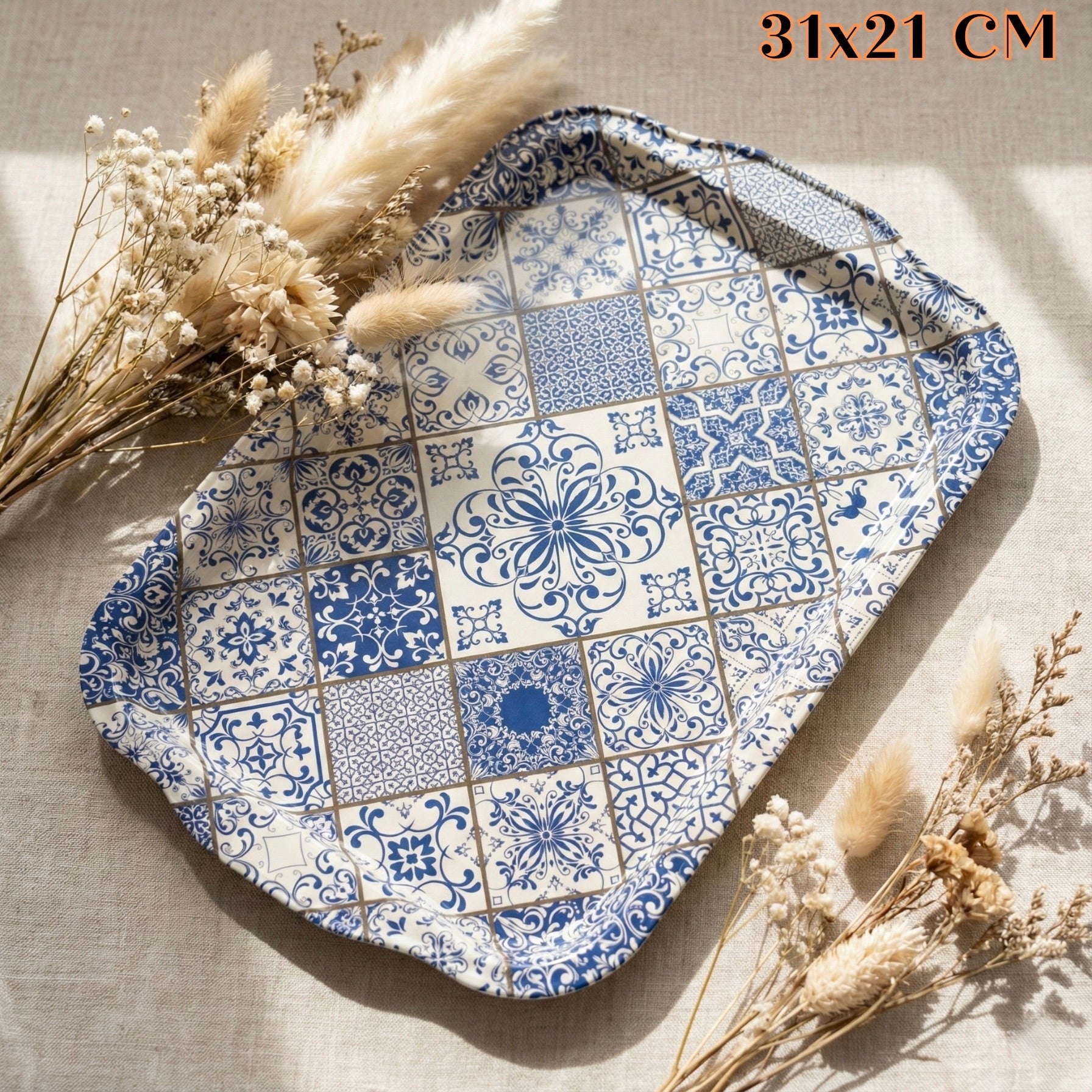 Otkrijte TRADICIONALNU METALNU TACNU! Pravokutna, s plavobijelim pločicama i profinjenim cvjetnim motivima u raznim nijansama plave na krem pozadini. Savršen dodatak za posluživanje!