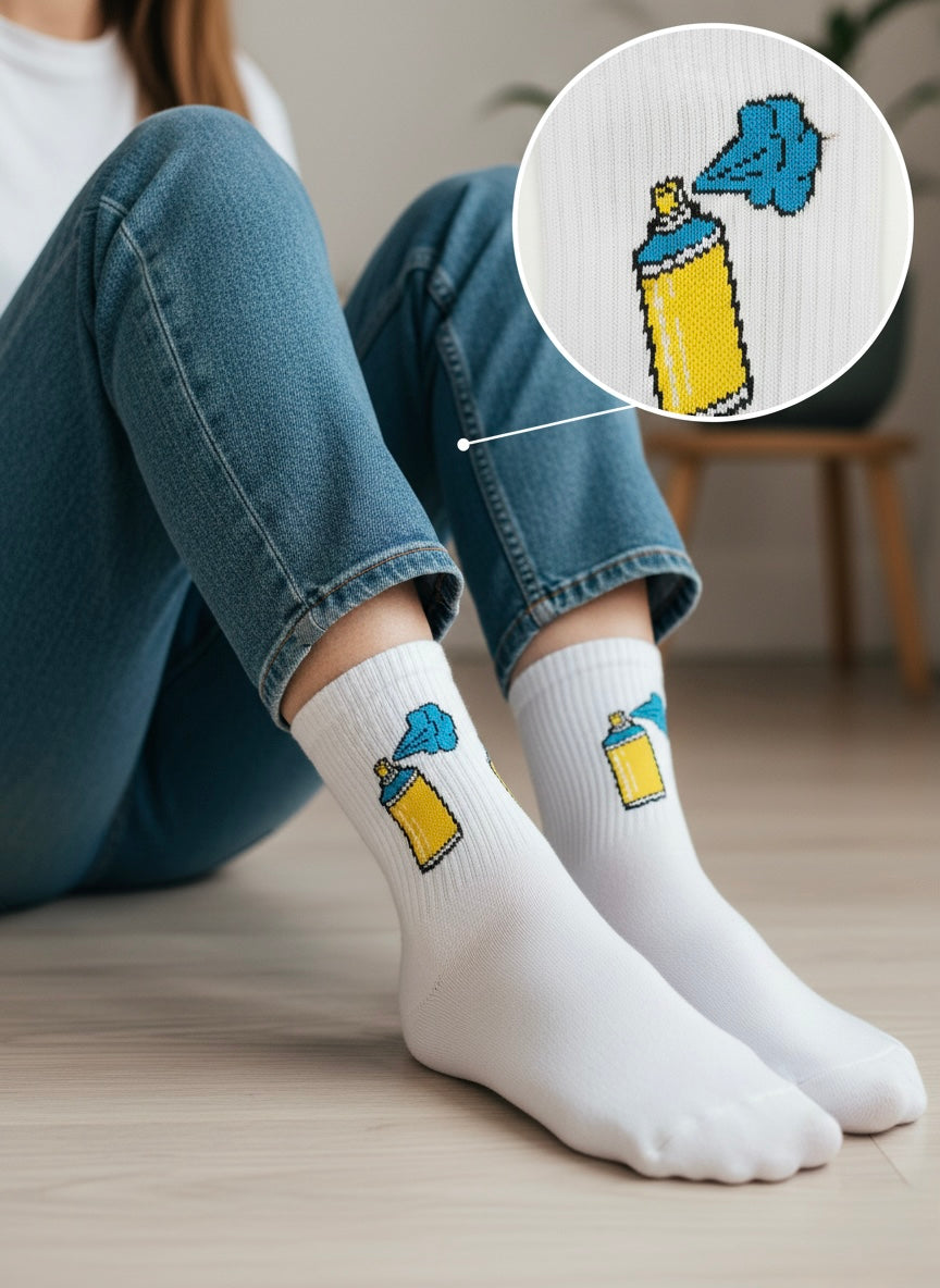 Bijele čarape s pikseliranim žutim sprejom i plavim mlaznicom